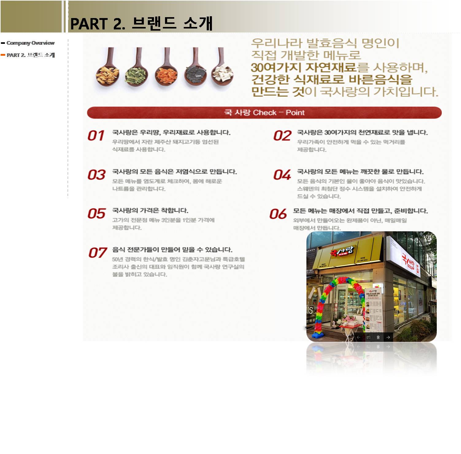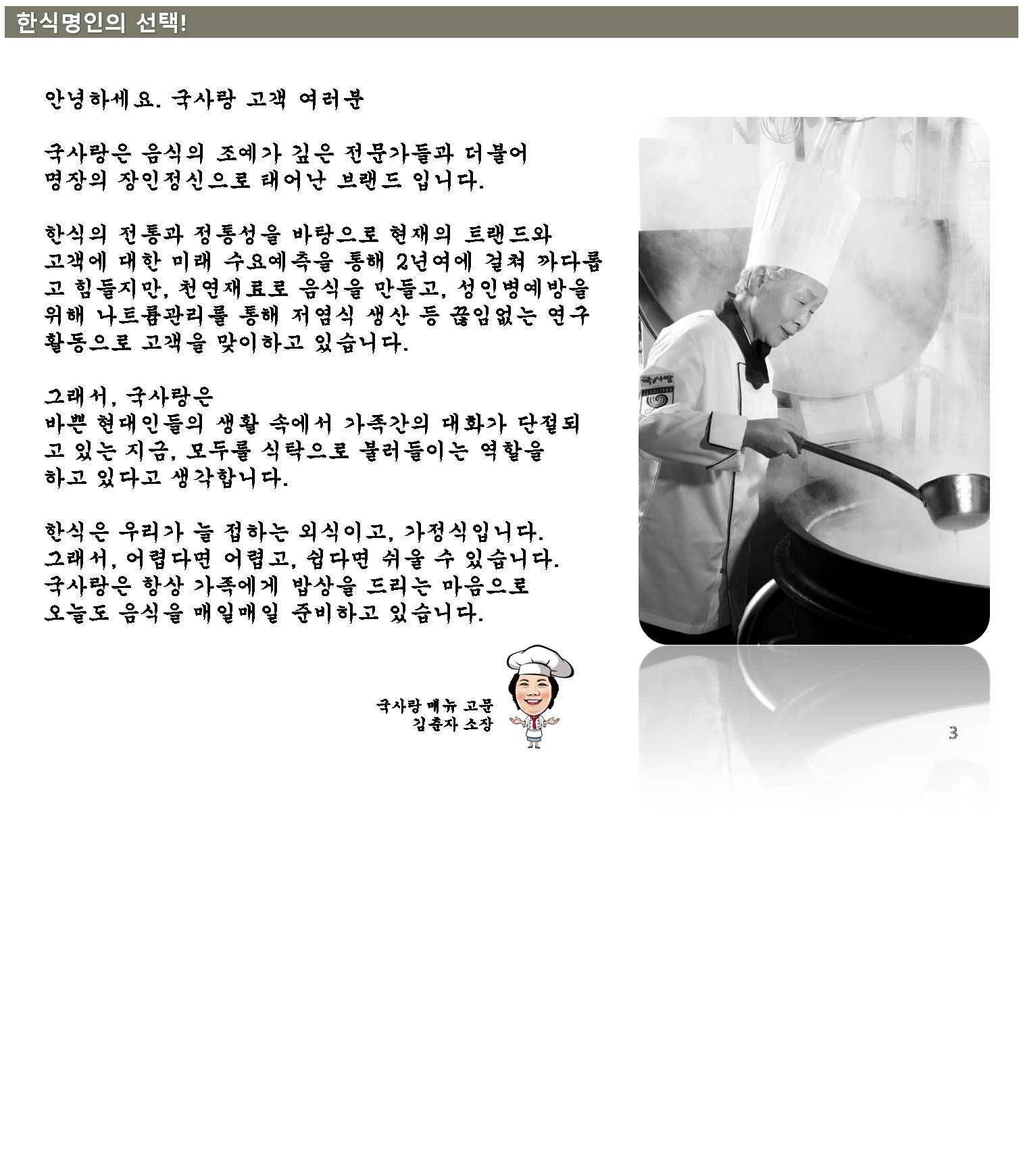 • ±¹»ç¶ûÀº À½½ÄÀÇ Á¶¿¹°¡ ±íÀº Àü¹®°¡µé°ú ´õºÒ¾î ¸íÀåÀÇ ÀåÀÎÁ¤½ÅÀ¸·Î ž ºê·£µå ÀÔ´Ï´Ù. ±¹»ç¶ûÀº °¡Àå Á¤Á÷ÇÑ ½ÄÀç·á·Î ¹Ù¸¥À½½ÄÀ» ¸¸µå´Â °ÍÀÌ °í°´À» ÇâÇÑ ¿ì¸®ÀÇ °¡Ä¡ ÀÔ´Ï´Ù